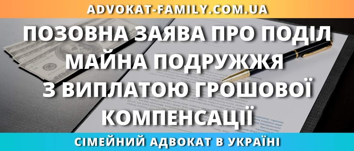 Позовна заява про поділ майна подружжя з виплатою грошової компенсації – є шаблонним зразком документу. Тому, попереджаємо користувачів сайту сімейного адвоката по розлученням, аліментам, поділу майна подружжя та іншим сімейним справам advokat-family.com.ua, які будуть використовувати даний шаблон при складанні власної Позовної заяви про поділ майна подружжя з виплатою грошової компенсації про їх особисту відповідальність за зміст складеного документа. І нагадуємо, що при самостійному складанні Позовної заяви про поділ майна подружжя з виплатою грошової компенсації Ви повинні не лише користуватись даним шаблоном, а й чітко дотримуватись вимог Сімейного кодексу України та норм Цивільного процесуального кодексу України, що регламентують вимоги до оформлення Позовної заяви про поділ майна подружжя з виплатою грошової компенсації.